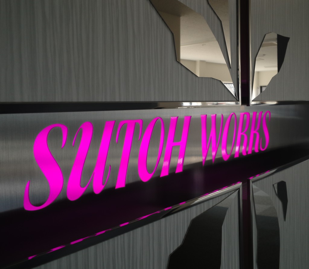 2層に浮かしたパネルを取り付け、既存の壁面と1層目パネルの間からのLED間接照明と、アールをかけた手前のパネルの隙間から覗く内照式のロゴが印象的なデザインウォール。